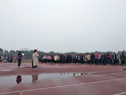 在流芳校区运动场举行升国旗仪式。学工部部长王涛,化环学院院长陈金毅、党委副书记苏纯华、全体辅导员、2018级全体副班主任以及2018级全体新生参加仪式。