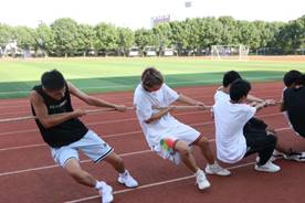 哨声一响,两边队伍就展开了交锋。参赛队员们紧握长绳,用尽全力。中间的红标左右移动,胜负难分。各班同学都在为自己的班级加油呐喊,气势十足。操场上哨子声,口号声,呐喊声此起彼伏,同学们的脸上洋溢着青春活力的笑容。