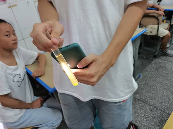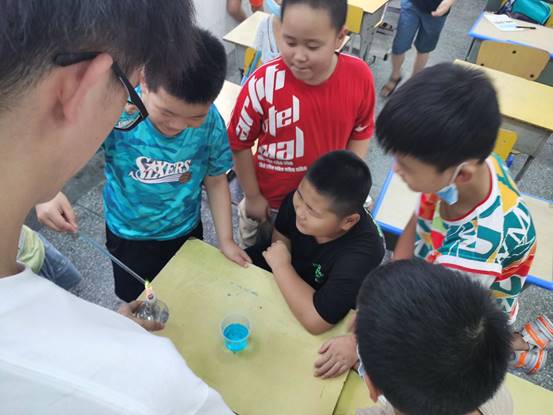 在队员们的细心讲解演示之下,在孩子们一阵接着一阵的惊叹声中,在孩子们与化环实践队队员的不断互动中,一堂课便接近尾声,在课程结尾,队员们给孩子们布置了课外实验作业——利用身边的资源,动手实践一个简单的科学实验,让孩子们从生活上体会科学蕴含的魅力,感受科学世界的奥妙。