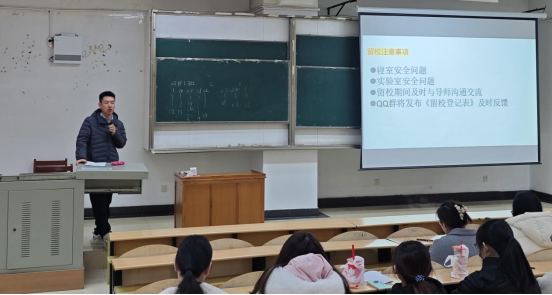 张光宇向同学们传达学校关于研究生寒假留校期间安全管理要求,分别宿舍安全、人身安全、留校及返校注意事项等作出强调。一是留校同学要遵守校规校纪,假期期间严格遵守宿舍管理规定,注意用电安全。二是完成科研任务后,务必在离校前将个人去向及离校具体时间告知辅导员和导师,保持通讯畅通。三是加强“朋辈互助意识”,充分发挥学生自我教育主体性,确保同学们留校期间学习生活平稳安全。
