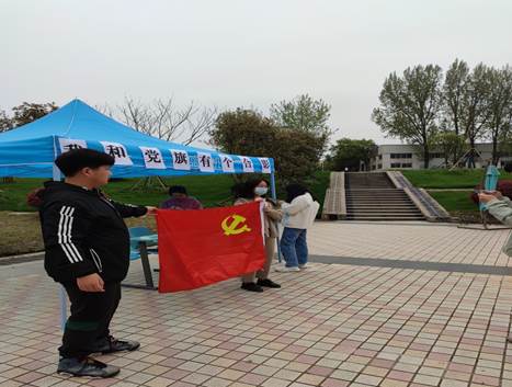 各个学院的同学们踊跃参加了此次活动,留下了一道道靓丽的身影,形成了校园独特的风景线。与此同时,活动负责人给参与活动的同学普及了党旗的由来和意义,加深了同学们对党的了解。