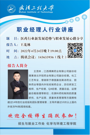 邀请湖北宇阳药业有限公司副总经理王茂林通过线上“腾讯会议”方式召开就业指导讲座,学院2019级全体本科生参与该讲座。