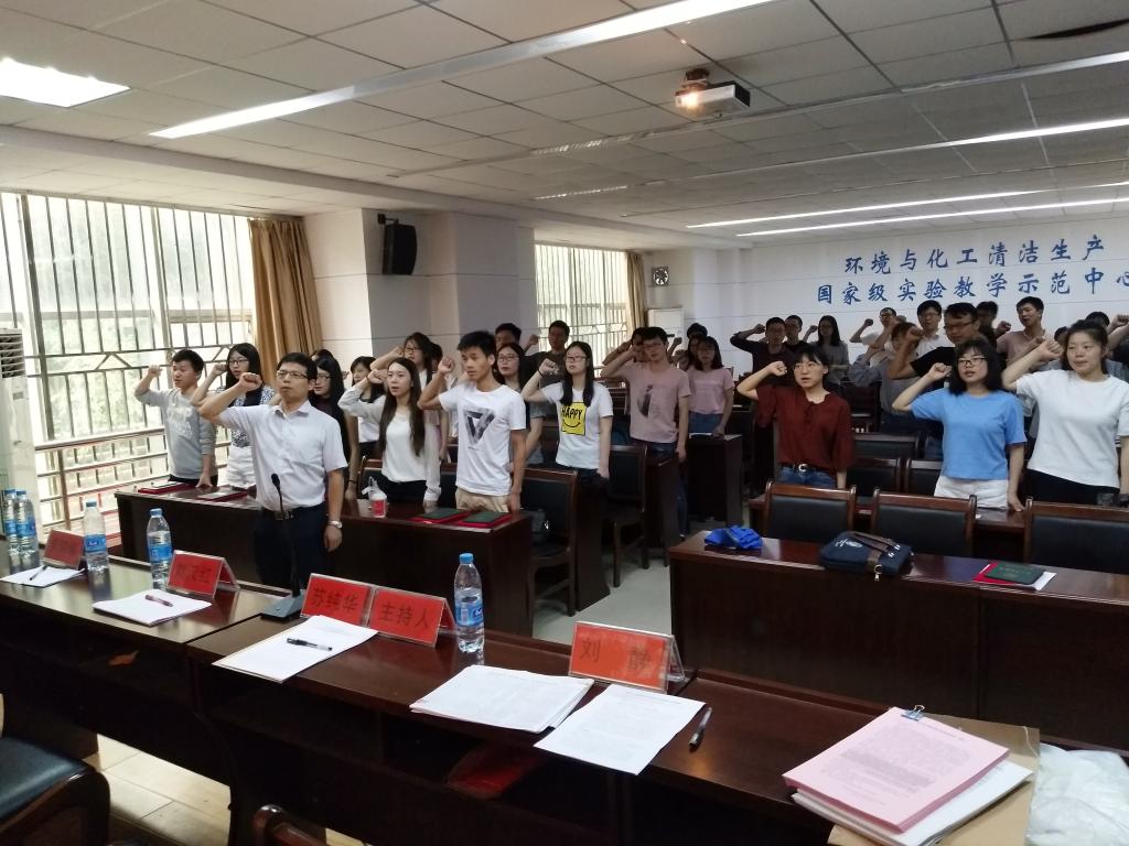 613午,化学与环境工程学2017届毕业生党员入党宣誓仪式暨爱校荣校主题党课在流芳校区1实验楼1101会议室隆重举行。学院党委书记刘汉红党委副书记苏纯华学院学生工作办公室李琪娜、刘静老师和2017全体毕业生党员共同参加。仪式由党委副书记苏纯华主持。