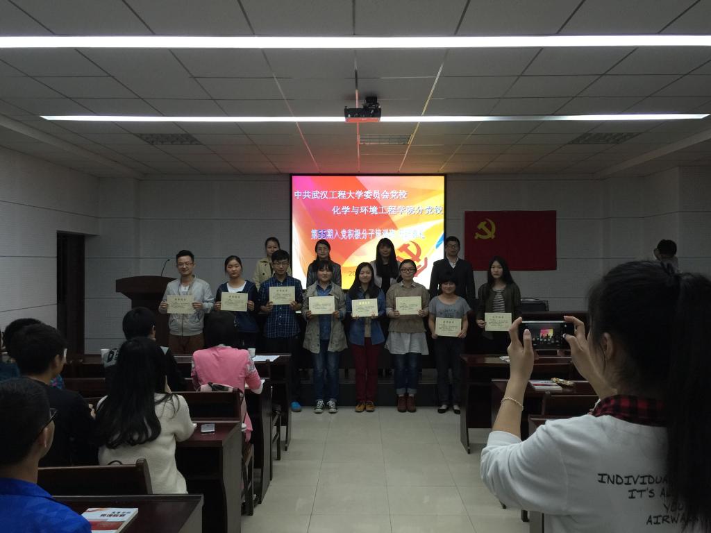 开班典礼在庄严的《国际歌》中拉开帷幕,首先对上期培训班的8位优秀学员(2014级研究生化环1班 饶丹华;2012级工业分析2班 苏凯;2012级环境工程1班 李婵;2012级环境工程1班 李张晔;2013级应用化学1班 孙芳文;2014级环境工程1班 王丽芬;2014级环境工程中美班 钱璟;2014级应用化学4班 吴玲敏)进行了表彰,上期优秀学员代表 钱璟同学和本期学员代表 王烨分别上台作了发言。