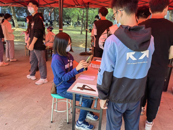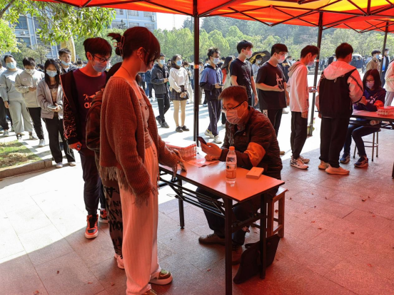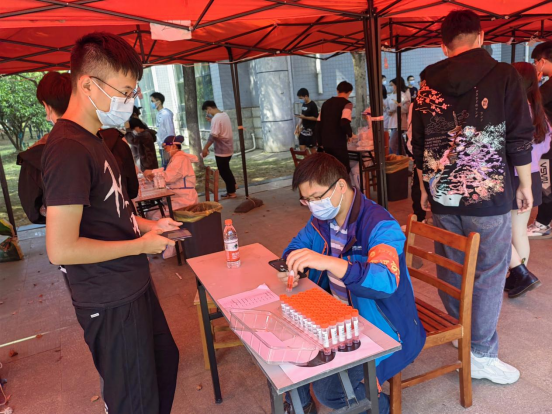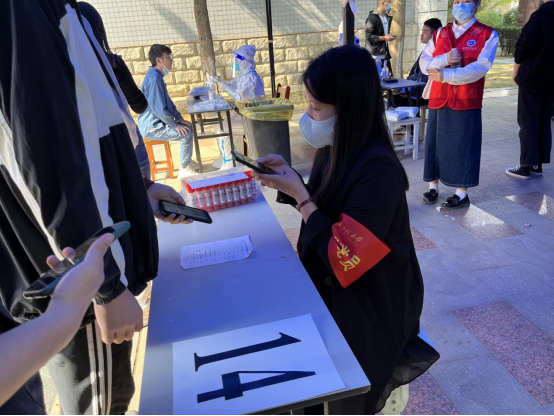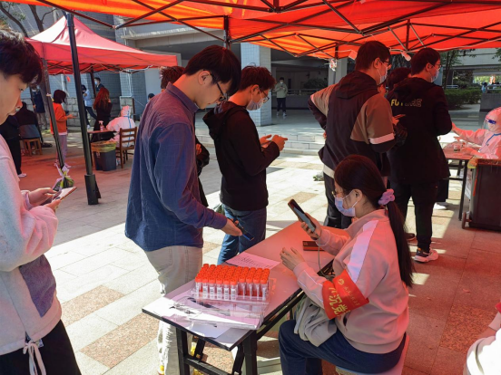 从11:00到13:30,面对源源不断到来的全校师生员工,下沉党员们始终一丝不苟地为师生扫码登记、严格核对身份信息,一刻也不停歇。面对来检测的同学,他们服务热情周到。对待手上的工作,他们严谨细致。他们用辛劳与汗水,以党员的责任担当筑牢校园疫情防控安全防线。