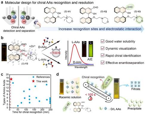 针对上述问题,研究团队将吗啉鎓季铵阳离子引入1,1'-联-2-萘酚分子骨架,设计并合成了一种手性荧光探针,在水溶液中成功实现了对氨基酸对映体的快速手性识别,及外消旋混合物中单一氨基酸对映体的分钟级高效手性分离。该探针与17对游离氨基酸对映体相互作用时,可在100秒内实现快速手性区分,并伴有显著的发光颜色或强度变化。研究表明手性识别机制涉及亚胺形成和静电相互作用,并伴随聚集诱导发光效应。这些过程共同促进了探针与特定氨基酸对映体之间的选择性聚集与沉淀。采用团队开发的该方法,通过简单过滤即可从D-/L-氨基酸混合物中高效分离出目标对映体,光学纯度达99%以上,且分离过程可视化。团队进一步结合荧光可视化和手性高效液相色谱对比分析,验证了该探针在手性分离方面的有效性。该研究为氨基酸对映体的精准检测与分离提供了一种简单快捷的新方法,具有非常重要的科学意义和应用价值。