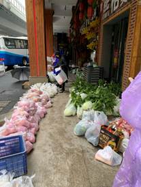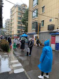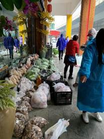 从开始在群里通知业主们自己领取,再到后来为减少接触,志愿者们对着各类物资清单逐一确认后,一一搬运到小拖车上,一个单元一个单元分批按门铃通知大家排队有序领取。由于各类物资近百种,总会出现错拿漏拿,我们又改进发放方法,志愿者们各守几类物资阵地,业主们按购物序号间隔领取。然后我每天穿梭于数百种各类生活物资摆出的阵地之间,为每一位业主配送货物,和业主本人一同检查并核对物资清单,场面热闹非凡、忙而有序。这是我们实战中摸索出的高效配送方案,也源于我们志愿者们之间的默契配合,相互搭把手、传个话、一个眼神、一个动作大家心领神会。每一位领取物资的人都会由衷地说一句:感谢你,辛苦啦!这样的工作伙伴这样的工作场景,我只想说累到满心欢喜!