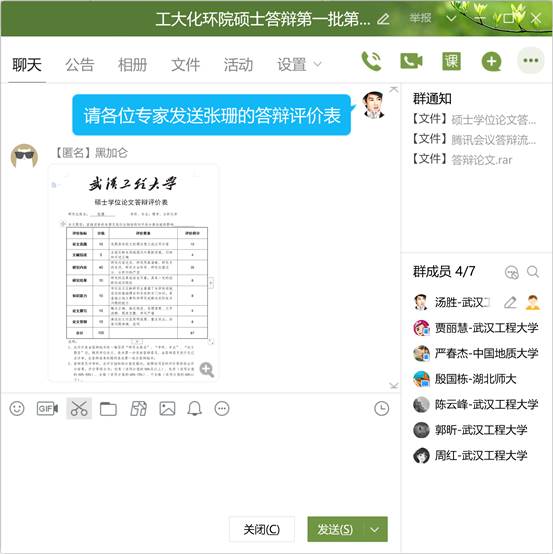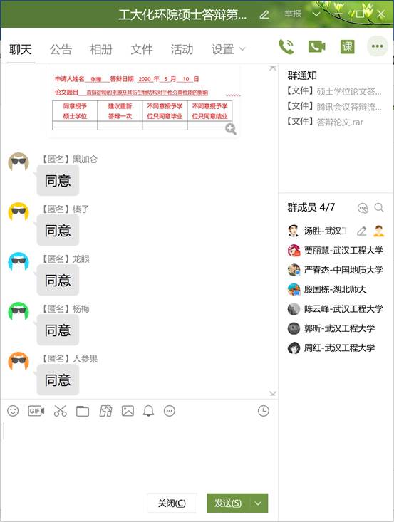 各小组研究生答辩结束后,答辩秘书组织除答辩委员和督导专家外的其他人员退出网络答辩会议室,检查并报告退席情况。答辩委员会对本组硕士学位论文水平及答辩情况评议评分,讨论综合学术评语,对是否通过答辩、建议授予学位进行无记名投票,形成答辩决议。特殊时期,答辩委员会的学位论文评价表及表决结果通过在QQ群匿名发送的方式进行。各答辩委员在事先建立好的QQ群匿名之后,根据答辩秘书的提示,依次发送对每位答辩学生的评价表及表决意见。答辩委员会综合讨论学位论文评语,形成答辩决议之后,答辩秘书组织答辩人、观摩师生进入视频会议室。答辩委员会主席宣读答辩决议和投票结果、是否通过答辩及是否建议授予学位。最后,答辩秘书组织答辩专家、督导及答辩学生通过视频截屏的方式“合影”留念。