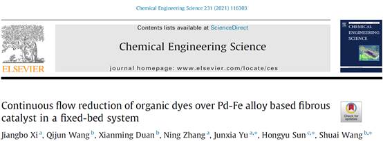 另外,奚江波老师还在《ChemicalEngineering Science》(二区,Top期刊)上发表了《Continuousflow reduction of organic dyes over Pd-Fe alloy based fibrous catalyst in afixed-bed system》(DOI: 10.1016/j.ces.2020.116303),在这项工作中,报道了一种基于连续流动化学催化系统。流动化学是非常适合于现代工业催化,不仅能提高生产效率,有利于可持续发展。奚江波老师与华中科技大学和丹麦技术大学合作,制备了锚定在N掺杂碳(NC)功能化纤维状硅酸铝纤维(ASFs)上的双金属Pd-Fe合金纳米颗粒催化剂,并构建了可用于有机染料催化还原的高性能的固定床催化系统,为高性能金属基催化剂提供了新的策略和技术参考。
