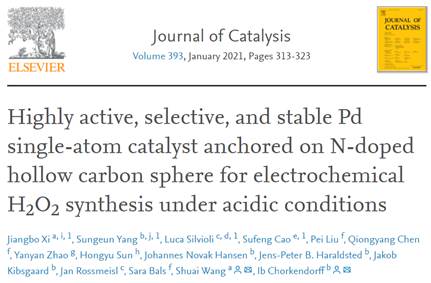 青年教师奚江波老师与华中科技大学、丹麦技术大学、哥本哈根大学、塔夫茨大学、安特卫普大学、波士顿学院和韩国科学技术院等高校和科研机构合作的研究成果:《Highlyactive, selective, and stable Pd single-atom catalyst anchored on N-dopedhollow carbon sphere for electrochemical H2O2 synthesisunder acidic conditions》(DOI: 10.1016/j.jcat.2020.11.020)。分散在固体载体上的单原子催化剂(SACs)具有单一活性位点(如孤立的原子金属物种),近年来在催化领域中引起了极大的关注。针对单原子催化剂电子结构的优化以及稳定性等问题,奚江波老师和合作者们报道报告了一种简便的合成方法,该方法可在还原的氧化石墨烯/N掺杂的碳空心碳纳米球(Pd1/N-C)上稳定原子Pd物种。Pd1/N-C催化剂表现出了电化学下H2O2的高产率。即使经过10,000次循环稳定性测试,也能保持单原子结构及其高H2O2生成量。单原子钯的存在及其与N的配位结构是其高活性、高选择性和稳定性的原因。此外,这次工作还发现N配位数和Pd原子周围的杂掺杂原子对于优化中间体*OOH的吸附能至关重要,从而可有效提高电化学制备H2O2活性和选择性。
