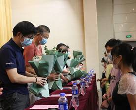 同学们向教师代表献花。