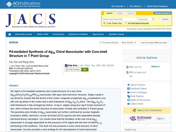 陈嵘教授课题组在Ag基纳米团簇方面取得重要进展——“Pd-mediated Synthesis of Ag33Chiral Nanocluster withCore-shell Structure in T Point Group”(唯一通讯单位,唯一通讯作者)。该论文的第一作者为明星ai换脸