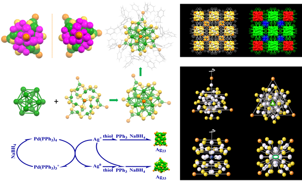 金属纳米团簇是间于金属纳米颗粒与金属有机配合物之间的一种过渡状态,研究这种过渡状态对于深入理解金属纳米颗粒的结构组成与性能具有重要的意义,但相关的合成与表征工作极具挑战。尤其在手性金基纳米团簇被报道后,众多研究工作者将注意力转到了手性纳米团簇上。尽管如此,到目前为止,仅有一例关于手性银基纳米团簇Ag23的报道。陈嵘教授课题组通过引入Pd元素,首次成功获得硫醇与三苯基膦保护的手性Ag33纳米团簇,并通过单晶结构对其结构进行了精确的确认。结果显示,该团簇为一个Ag13的正十二面体的核与一个Ag20S24P4核组成的核壳结构。整个核壳结构具有四个三重旋转轴与三个二重旋转轴,所属点群为T群。团簇的核磁共振与TD-DFT理论计算结构很好的支持了该结论。在精确确定该团簇结构后,又对Pd在该团簇的合成中的作用进行了探讨,并首次提出Pd介入Ag33合成的催化合成机制。该合成机制为后续Ag基纳米团簇的合成提供了一条新的思路,并有望用于更多新型Ag基纳米团簇的合成中。