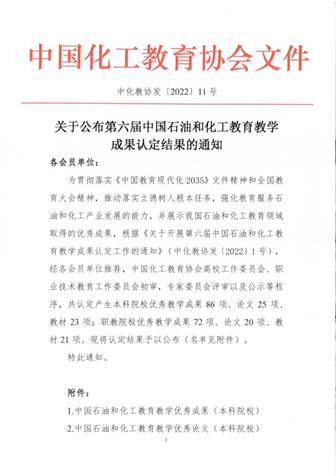 中国石油和化工教育教学成果奖由中国石油和化学工业联合会、中国化工教育协会联合设立,旨在提高我国石油和化工教育教学水平,促进石油和化工教育更好地服务行业经济发展,是全国石油化工领域重要的行业奖项。据悉,本次评选工作共收到来自高等本科院校、职业院校、企业和国家开放大学石化学院学习中心等会员单位500余项成果(含论文、教材)。经过专家初审、复审等程序,共认定本科院校优秀教学成果86项、论文25项、教材23项。