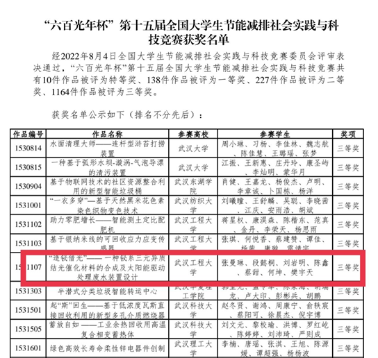 (通讯员 贾丰成)近日,第十五届全国大学生节能减排社会实践与科技竞赛在天津大学落下帷幕。由化环学院推送的参赛作品《“造铋借光”——一种铋系三元异质结光催化材料的合成及太阳能驱动处理废水装置设计》,在柯军、张哲两位老师的共同指导下,由2018级环境工程专业张曼琳负责,在刘岩明,段懿桐,陈鑫,蔡甜,何坤,樊宇天等同学的共同努力下,荣获国家三等奖。