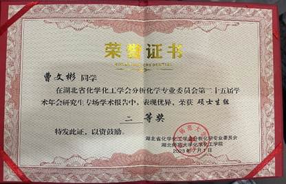 部分老师和研究生参加了此次会议。2021级硕士研究生曹文彬(导师:刘东)在会议上作了主题为《MOF-on-MOF衍生碳负载的铜钴氧化物用于生物小分子传感》的报告,并荣获研究生组二等奖。