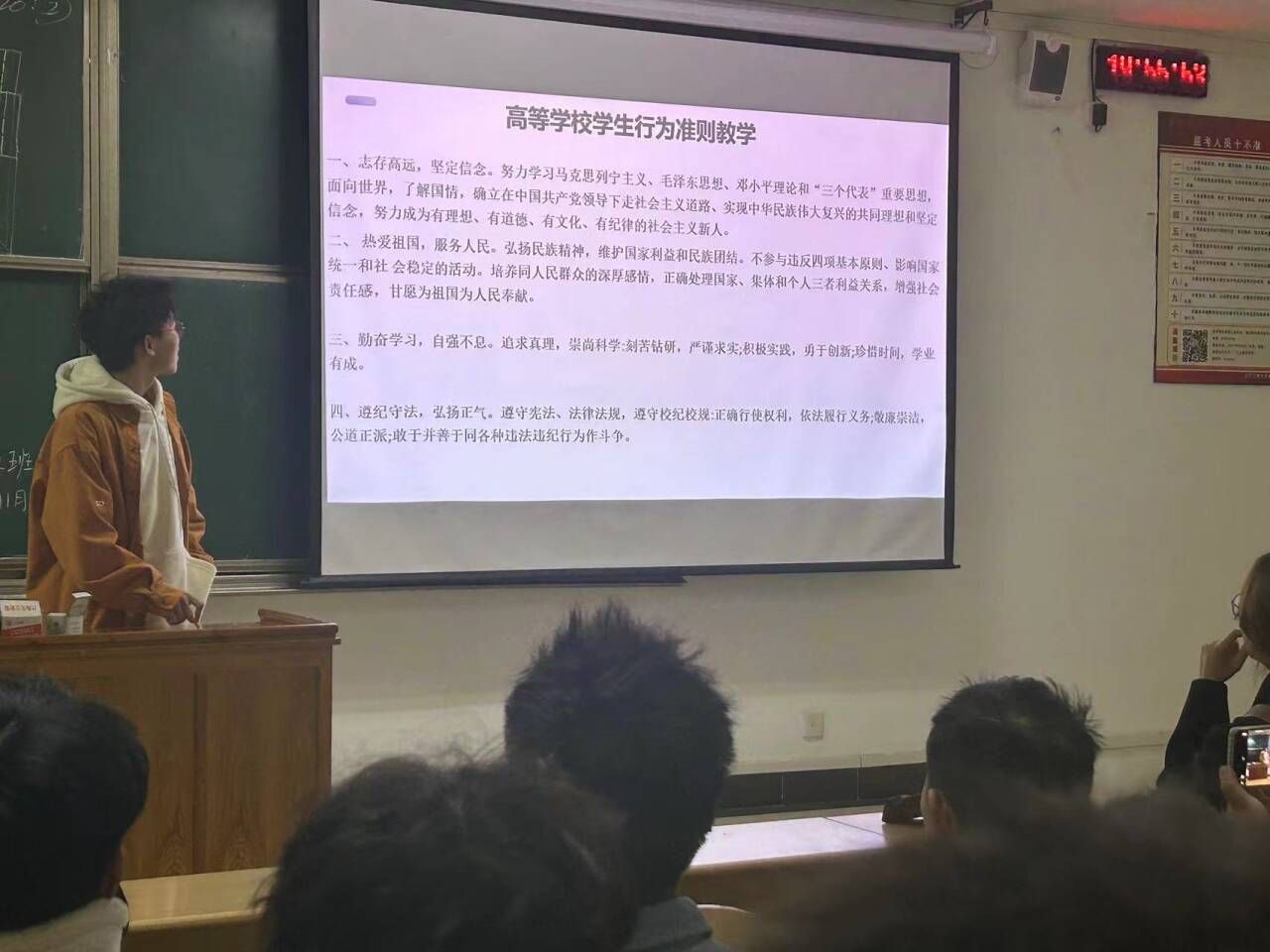 本次班会是对学生进行文明修身教育,属于新生入学教育的重要内容。有利于学生深入了解行为准则,既帮助学生认识到了遵守规章制度的重要性,树立正确价值观,也引导学生培养良好文明习惯,营造良好校风学风。(审稿 许守飞)