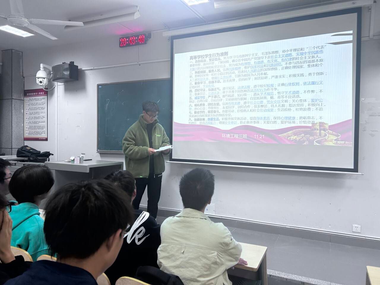 各班团支书在班会中为同学们解读《高等学校学生行为准则》中的重要内容,阐明学习《高等学校学生行为准则》的重要意义和必要性,提出要进一步弘扬积极进取精神,引导同学们坚定理想信念,形成良好道德品质,养成文明行为习惯,勤奋学习,强健体魄,成为社会主义合格建设者和可靠接班人。