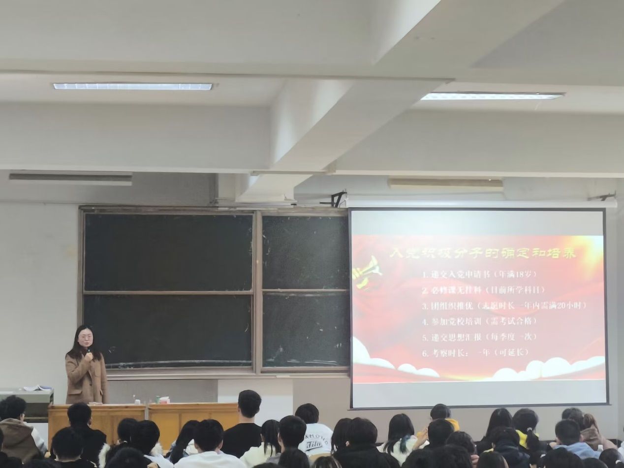 会议以“为什么要入党”“入党条件”“入党的主要流程”等四个板块展开,重点阐释了当代青年学生的使命和责任。从党的事业发展需要青年,青年成长需要党的培养等方面作了深刻的介绍,进一步端正了学生的入党动机,鼓励学生以实际行动争取早日加入党组织。