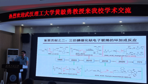 黄教授以《立体多样性1,3-偶极环加成反应》为题,首先介绍了课题组在1,3-丁二烯的制备和三价膦催化缺电子联烯的环加成两方面所取得的进展,并提出了相关具有挑战性的研究问题。随后,黄教授详细介绍了烷基硝酮的1,3-环加成反应、叶立德构建氮杂环反应和探索偶极环加成的反应历程三个方面的成果。黄教授以实验探索、底物拓展、机理研究的顺序介绍了他的工作,同时提出当前领域依旧存在的挑战。同时,黄教授详细地解答了在场师生的提问,并对其课题组提出的方法学在合成领域的应用进行了展望。