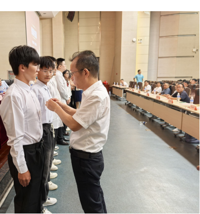 学院领导为2024级本研新生代表佩戴校徽。象征着新生正式成为一名真正的工大人,“格物明理,致知笃行”的校训精神,也将在同学们身上得到传承。