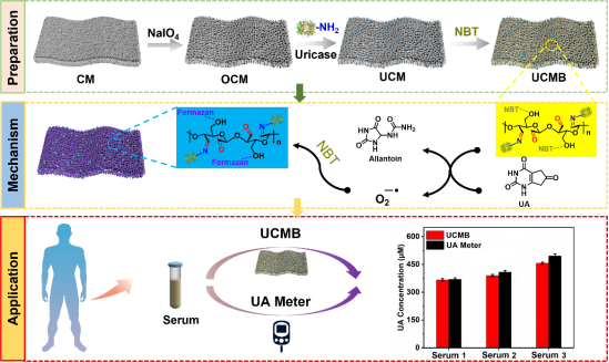 针对以上问题,团队联合开发一种简便易使用的纤维素基比色传感器(UCMB)用于尿酸的可视化检测,其原理是将尿素酶(Uricase)和硝基氯化四氮唑蓝(Nitroblue tetrazolium chloride,NBT)分别通过希夫碱共价作用和吸附作用负载到纤维素膜上。当尿酸检测时,UCMB负载的Uricase能特异性的氧化尿酸并产生氧负离子自由基,进而氧化NBT为甲瓒,引起UCMB从亮黄色到深紫色的颜色改变,从而实现尿酸的可视化检测。并且UCMB能够实现15min内对宽范围尿酸浓度(0-1000 μM)的线性检测,表现出高尿酸血症检测和诊断的潜力(血尿酸正常值 90-420 μM,高尿酸血症 > 420 μM)。通过与商品化的尿酸检测仪对比,UCMB在实际血清样品的检测中显示出高度的一致性,误差小于8%,确保了真实血清样本的精确检测。UCMB有望发展为家庭简易使用的便携式尿酸检测试纸,这对于普及尿酸检测、提高公众对高尿酸血症的认识和预防痛风具有重要意义,显示出良好的应用前景。