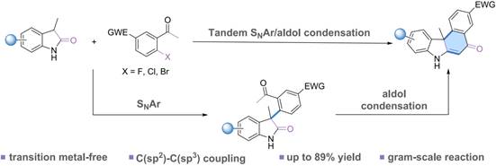 季碳稠合吲哚啉作为众多天然生物碱中的优势结构片段,因其具有抗肿瘤、抗炎和抗病毒等多种广泛的生物活性,一直以来都备受关注,开发高效实用的含季碳中心的2,3-稠合吲哚啉骨架的合成路线对于有机合成和药物合成领域具有极其重要的价值。目前,合成该骨架最常用的方法是利用3-取代吲哚或2,3-二取代吲哚的C3-烷基化去芳构化/环化串联反应,但这些方法往往需要复杂的预官能团化的吲哚衍生物,这很大程度上限制了合成产物结构的多样性。本文将碱促进的 SNAr 与分子内羟醛缩合反应相结合,开发了一种无过渡金属参与的串联策略,成功实现了从易得的3-取代吲哚-2-酮和邻卤苯乙酮出发,一锅法组装具有重要功能的C3位具有季碳中心的2,3-稠合吲哚啉。本研究首次报道了利用非吲哚底物串联构建季碳稠合 2,3 - 吲哚啉的新方法,同时进一步拓展了2-吲哚酮新的反应方法学。
