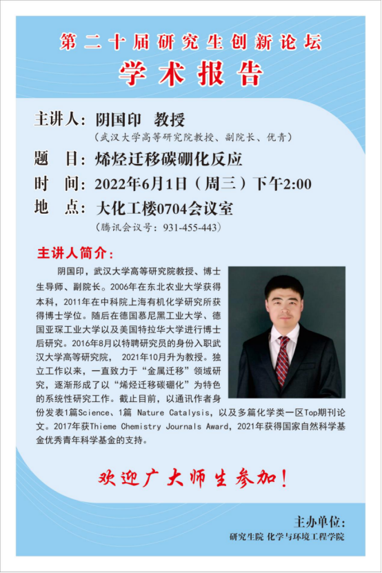 武汉大学阴国印教授学术报告预告