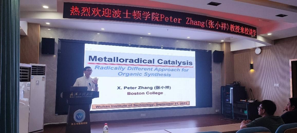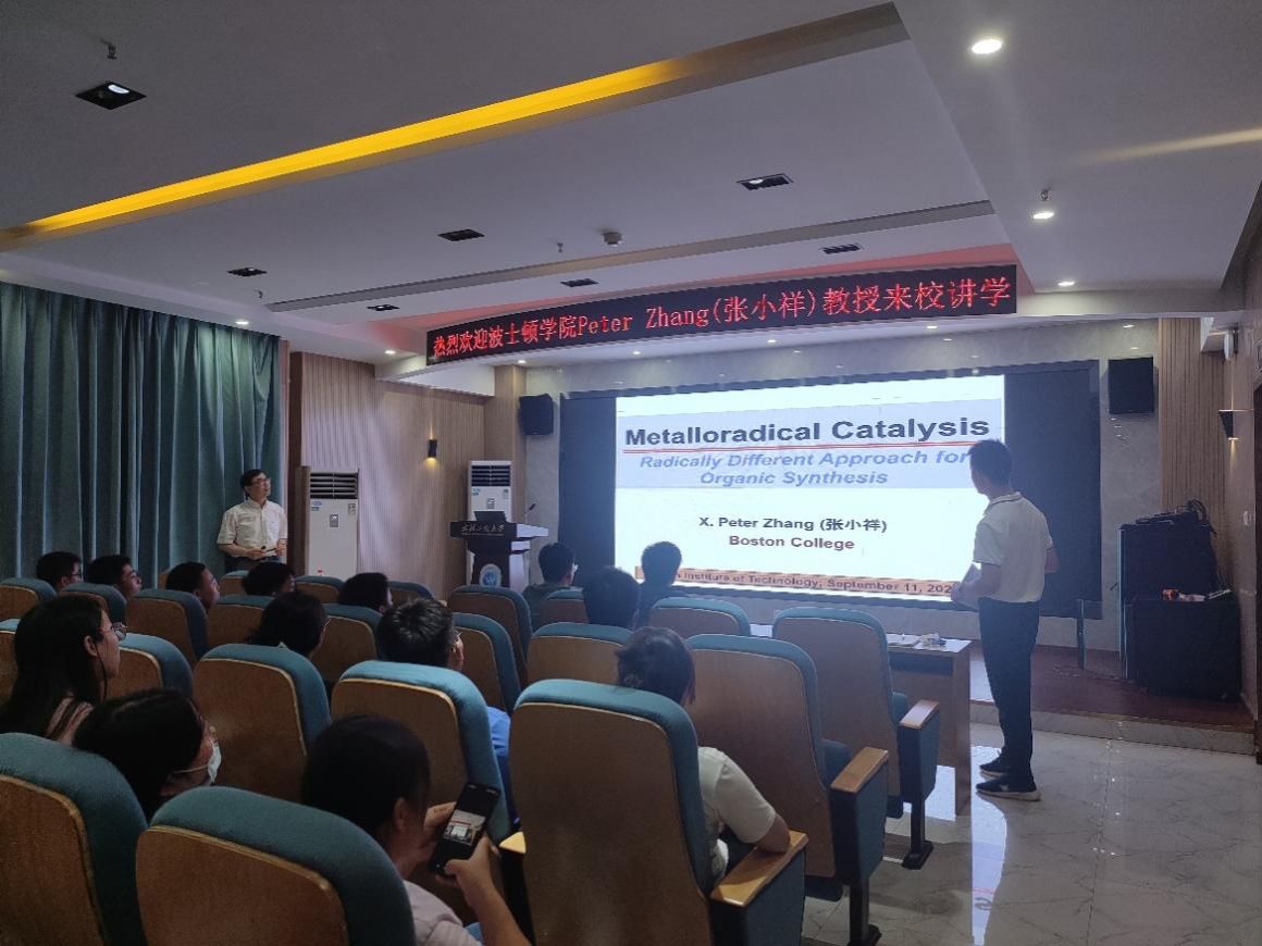 师生进行了学术交流,并做了题为“Metalloradical Catalysis (MRC): Radically Different Approach for Organic Synthesis”的学术报告,报告会由化环学院副院长董志兵教授主持。张教授主要介绍了基于金属-卟啉配合物的不对称“金属自由基催化”反应(MRC)。通过设计并合成一系列手性金属(钴、铁等)-卟啉自由基催化剂,将金属自由基催化(MRC)应用于立体选择性的环化反应、C-H官能化反应、串联反应等,并成功应用于复杂功能分子的合成。